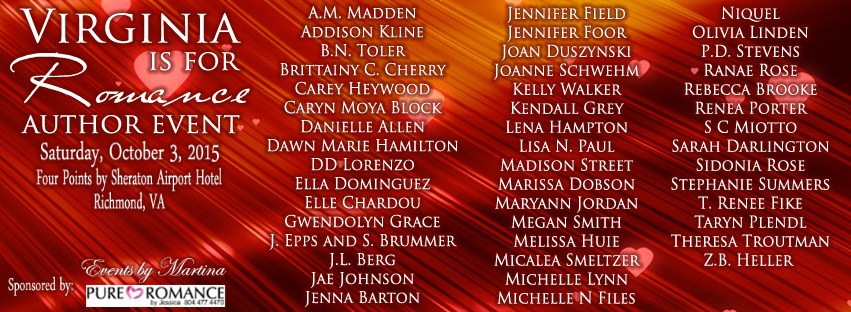 Three Book Signings - One Great Event - October 3, 2015 Come to Four Points by Sheraton Richmond Airport to meet the Romance Authors you love. First Session runs from 9 am - 11 am. Second Session runs from 11:15 am - 1:15 pm. Final Session runs from 2 pm - 4 pm. Get your ticket… Continue reading Virginia is for Romance – Richmond Virginia